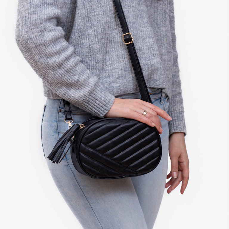 - Классическая женская сумка. Выполнена из экологичной кожи со стеганным покрытием. Модель украшена бахромой, внутри есть один открытый карман и один карман на молнии. Съемный ремень с возможностью регулировки.