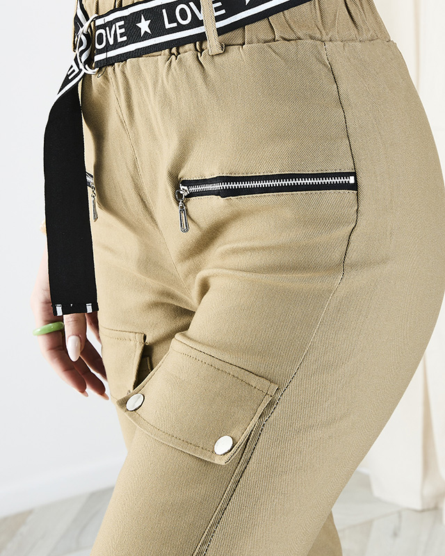 • Стильные женские брюки карго, изготовленные из эластичной ткани. Модель имеет эластичный пояс, дополнительно ремень с надписями, четыре кармана. Снизу отделаны резинкой. ПРИМЕЧАНИЕ: Точность измерения (+/-) 1 см.