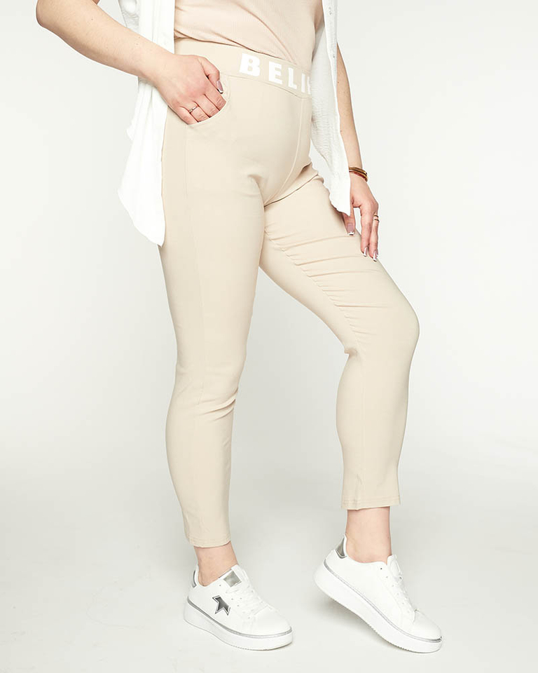 • Модные женские брюки из ткани с эластичным поясом и передними карманами. Модель с завышенной талией и надписью на талии. Идеальная основа для многих повседневных образов! ПРИМЕЧАНИЕ: Точность измерения (+/-) 1 см.
