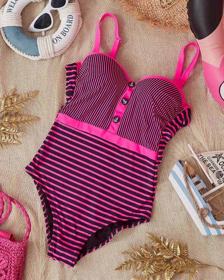 - Фантастический женский полосатый купальник, украшенный пуговицами. Модель с усиленными чашечками и пуш-апом, завязками на спине и регулируемыми бретелями. Я должен быть в твоем чемодане во время отпуска! ПРИМЕЧАНИЕ: Точность измерения (+/-) 1 см.