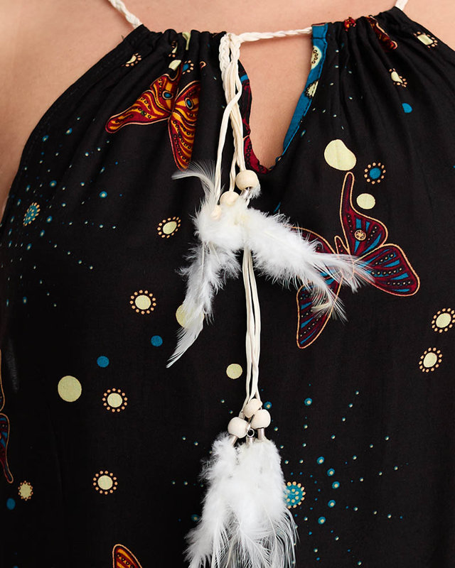 • Оригинальное летнее женское платье до колена с бабочками, на бретелях. Модель имеет расклешенный низ и удлинение по бокам, а также уникальную окантовку по круглому вырезу в виде завязки с перьями. ПРИМЕЧАНИЕ: Точность измерения (+/-) 1 см.