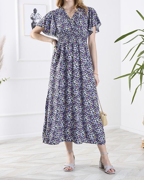 - Женское длинное платье, выполненное из легкой, ткани, отделанной цветочным узором. Модель с короткими рукавами, имеет вырез-конверт и широкий эластичный пояс. Прекрасная основа для многих летних нарядов! ПРИМЕЧАНИЕ: Точность измерения (+/-) 1 см.