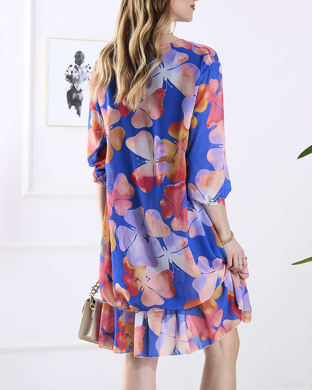 - Стильное платье свободного кроя оверсайз, с рукавами 3/4, заканчивающимися резинкой. Материал изготовления - полиэстер. Платье имеет вырез сердечком и отделано оборкой. Модель до колена, декорирована принтом. ПРИМЕЧАНИЕ: Точность измерения (+/-) 1 см.