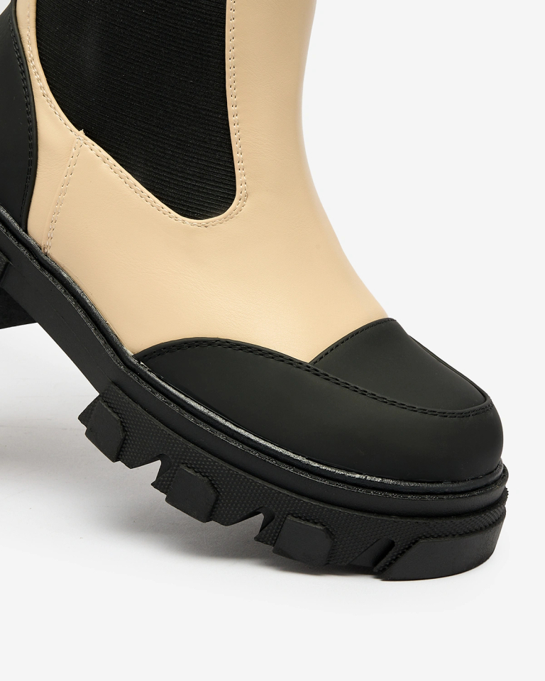 - Женские полусапоги, выполненные из экокожи, с тканевой стелькой. Модель на плоском каблуке. Декоративные вставки из матовой экокожи на носу и пятке. Застежка на молнию с эластичной вставкой сбоку.