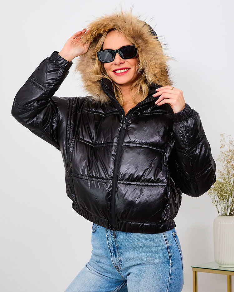 - Женская короткая куртка, выполненная из материала a'la cerata:- съемный капюшон с мехом- карманы по бокам- стеганая курткаИдеальная модель для осени!