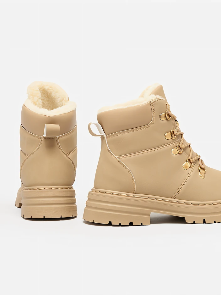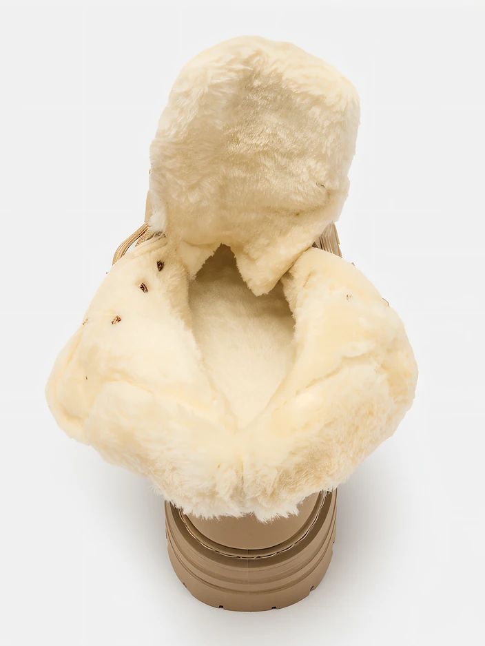 - Утепленные женские трепперы, выполненные из экокожи. Верх связан, утеплен внутри в виде меха. Бетонная обувь для плохой погоды!