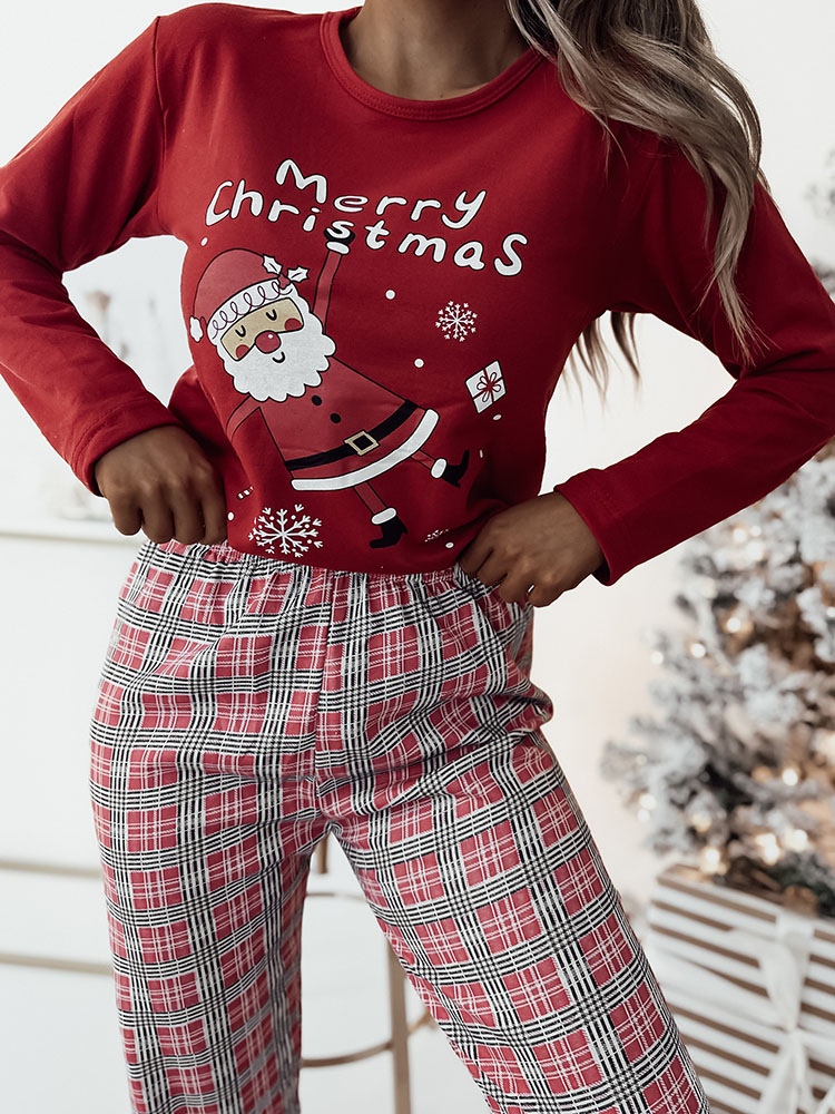 - Рождественская женская пижама из двух частей, выполненная из хлопчатобумажной ткани с декоративным принтом. Комплект состоит из кофты с длинными рукавами и брюк с эластичным поясом и прямыми ножками.