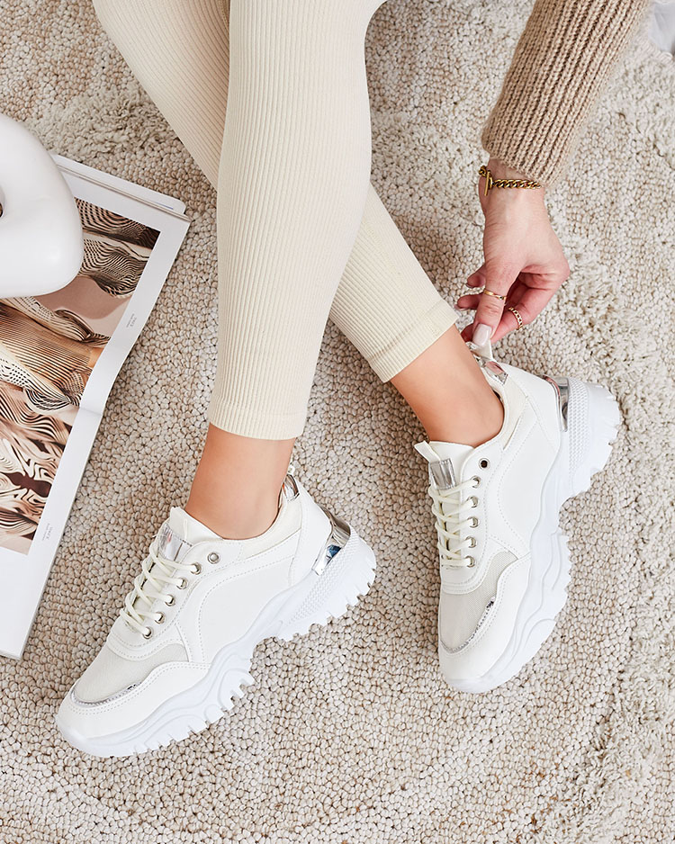 - Женские спортивные кроссовки из эко-кожи. Внутри имеется тканевая стелька. Модель на шнуровке, на сплошной подошве с серебристой вставкой сзади. Станут отличным аксессуаром для повседневного стиля.