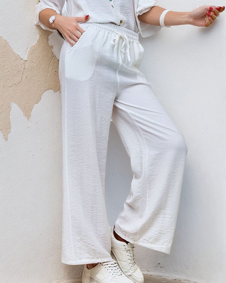 • Повседневный женский комплект из приятного материала. Рубашка с длинными закатанными рукавами застегивается на пуговицы. Широкие брюки с эластичным поясом, 2 карманами и завязками.