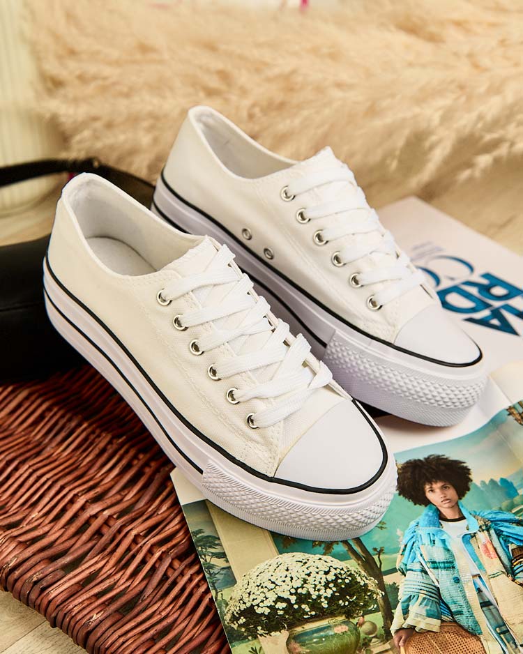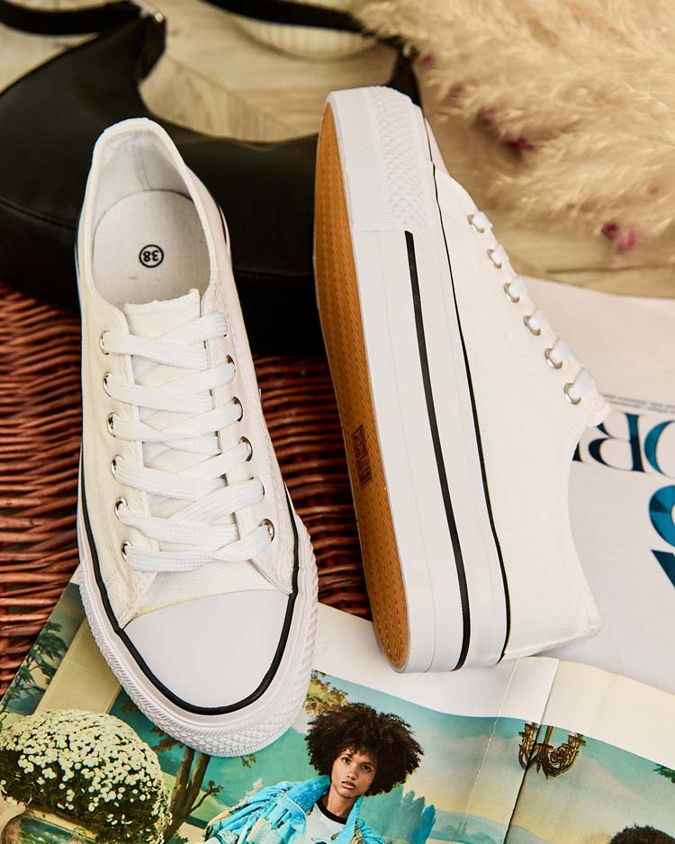 • Стильные женские спортивные кроссовки из тканевого материала. Модель на удобной платформе. Верхняя часть украшена шнуровкой. Отлично подойдут для создания повседневных нарядов!