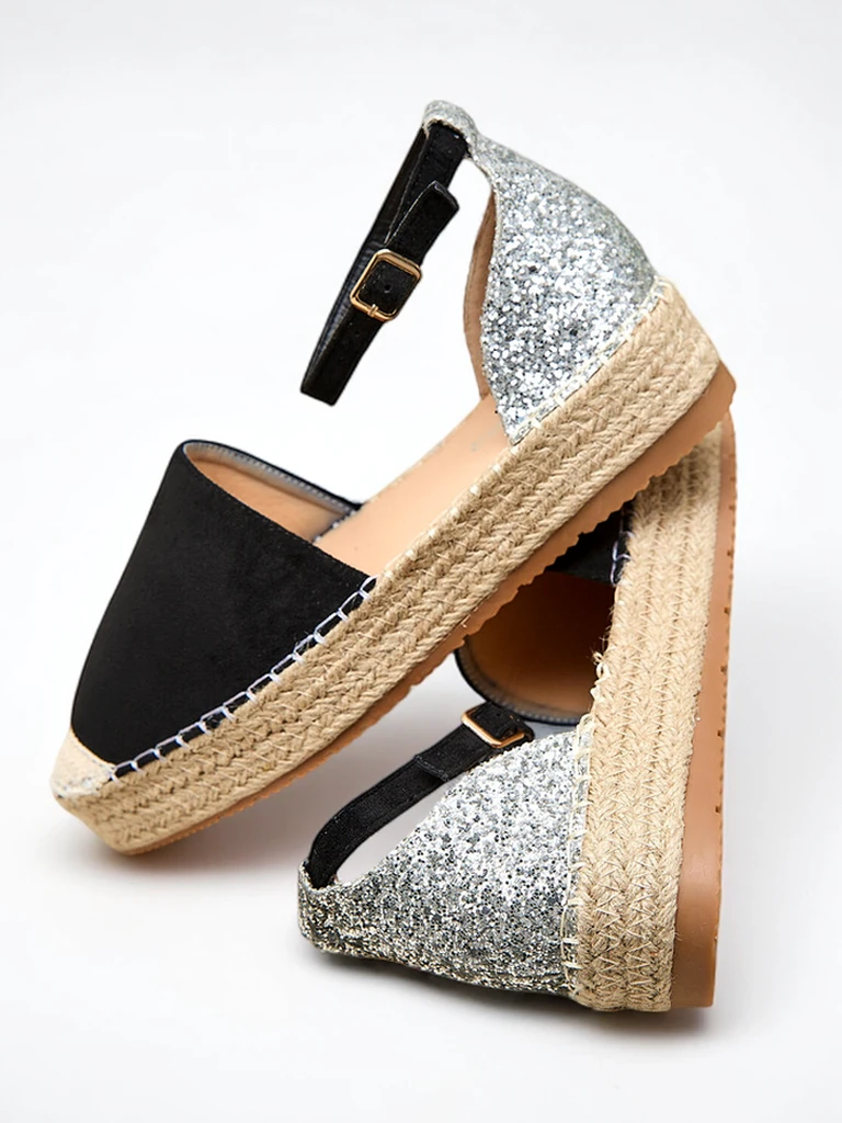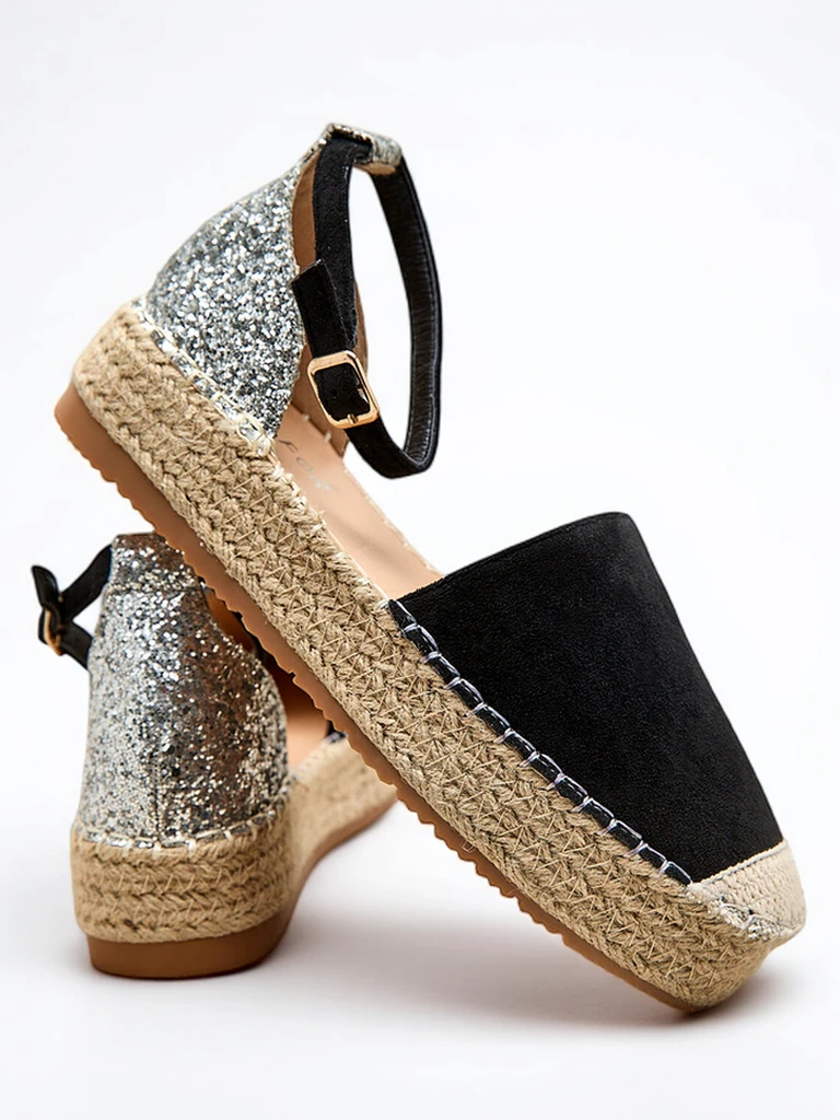- Уникальные женские эспадрильи из эко-кожи и ткани с блестками. Стелька из экокожи. Плоская подошва украшена джутовым шнуром для комфорта. Застегиваются на пряжку. Прекрасное дополнение к летнему стилю!