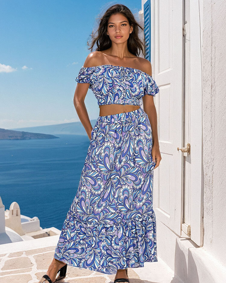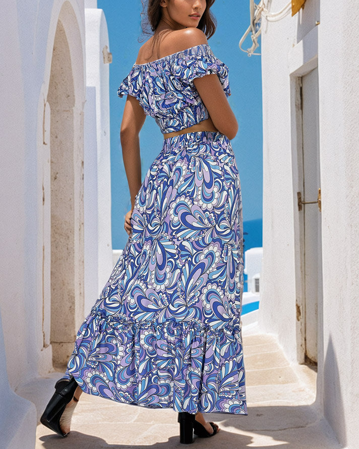 - Узорчатый летний женский комплект из приятной, легкой ткани. Короткий топ в испанском стиле имеет круглый вырез и эластичный пояс. Длинная юбка с эластичным поясом и декоративными оборками. ПРИМЕЧАНИЕ: Точность измерения (+/-) 1 см.