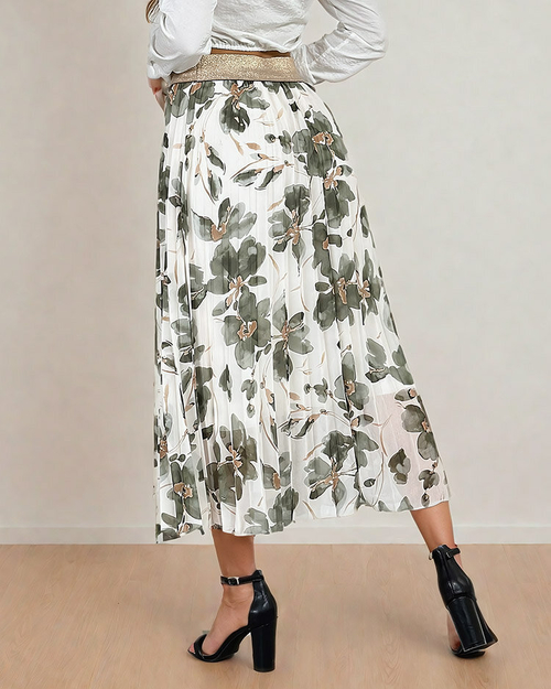 - Женская плиссированная юбка длины миди. Модель имеет эластичный пояс, который отлично подчеркивает талию. Кроме того, украшена цветочным узором. Эта юбка станет отличным акцентом вашего повседневного образа!