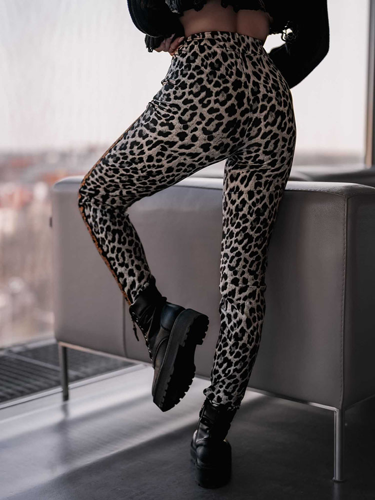 - Стильные леггинсы из эластичной ткани. Широкий эластичный пояс обеспечивает комфорт при носке. Все украшено животным принтом и цирконами. Отлично подойдут для создания стильных нарядов!