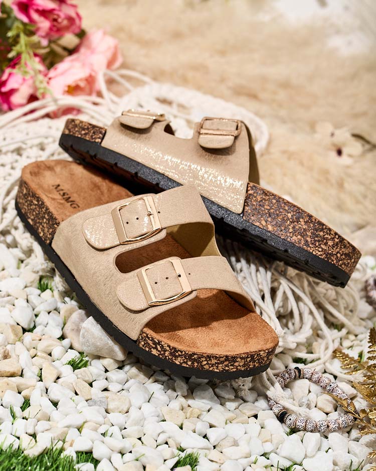 • Отличные женские шлепанцы на плоской подошве. Изготовлены полностью из экологичной кожи. Имеют декоративные пряжки на верхней части. Подошва декорирована материалом а'ля пробка. Отличный выбор для отпуска!