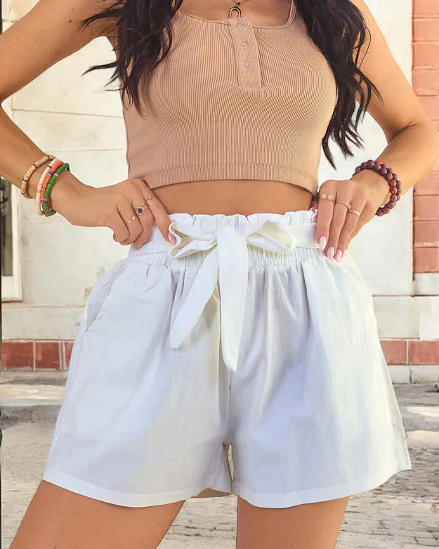 - Легкие женские короткие шорты из ткани. Модель с высокой талией, имеет два кармана и эластичные штанины на талии. Идеальный выбор для лета! ПРИМЕЧАНИЕ: Точность измерения (+/-) 1 см.