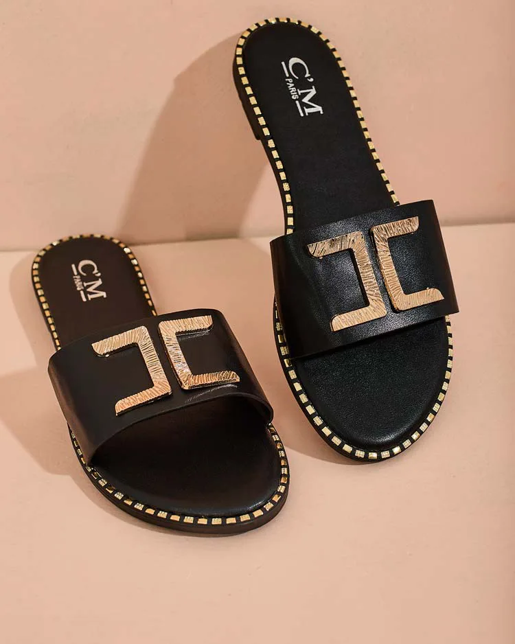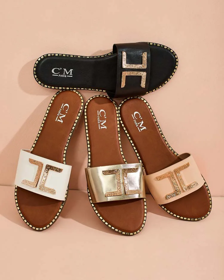 - Отличные женские шлепанцы на плоской подошве. Изготовлены полностью из экологичной кожи. Они имеют тонкий декор на верхней части. Отличный выбор для отпуска!