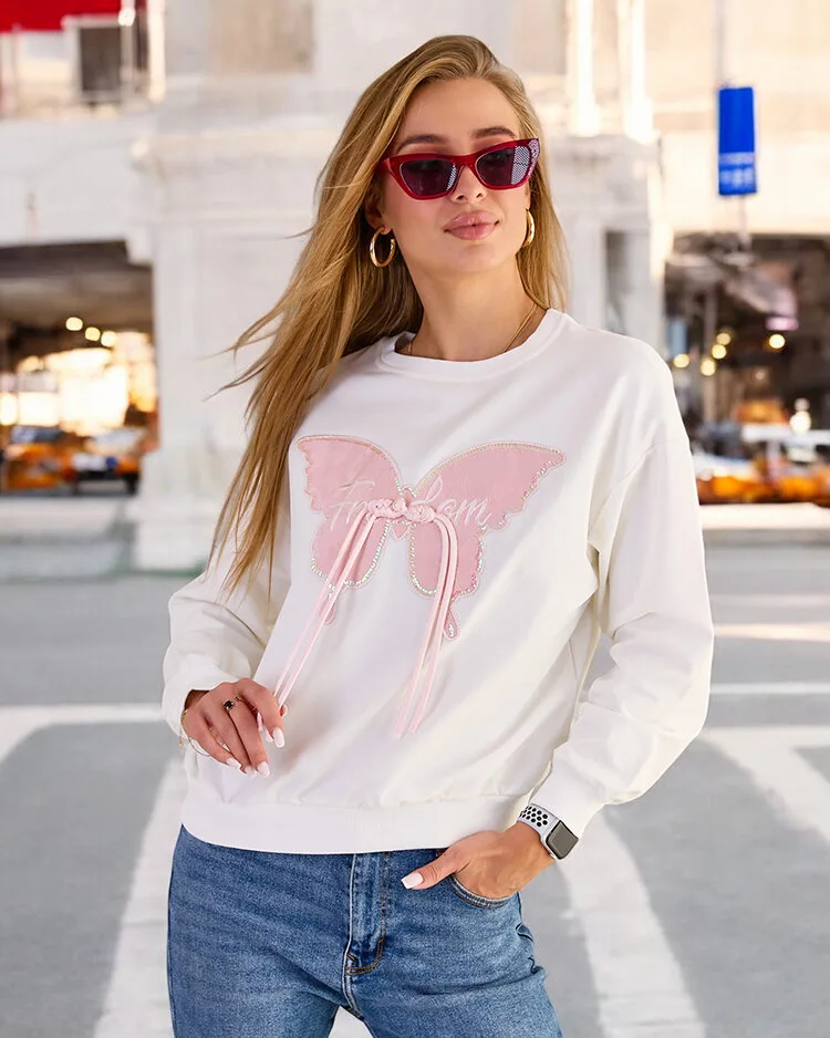 - Добавьте изюминку своим нарядам с помощью нашей тонкой толстовки, украшенной нашивкой с бабочками. Надевается через голову, имеет круглый вырез и длинные рукава. Идеально подходит на каждый день, когда вы хотите чувствовать себя непринужденно, но стильно!