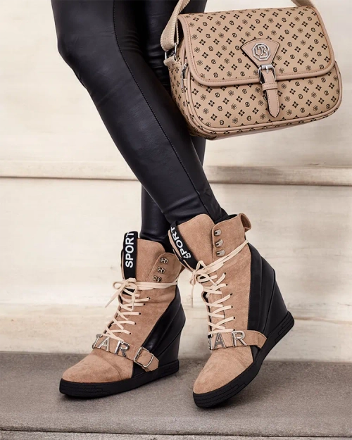 - Спортивные женские ботильоны на каблуке, выполненные из комбинации эко-кожи и эко-замши. Ботинки с декоративной отделкой в верхней части, тканевая стелька внутри.