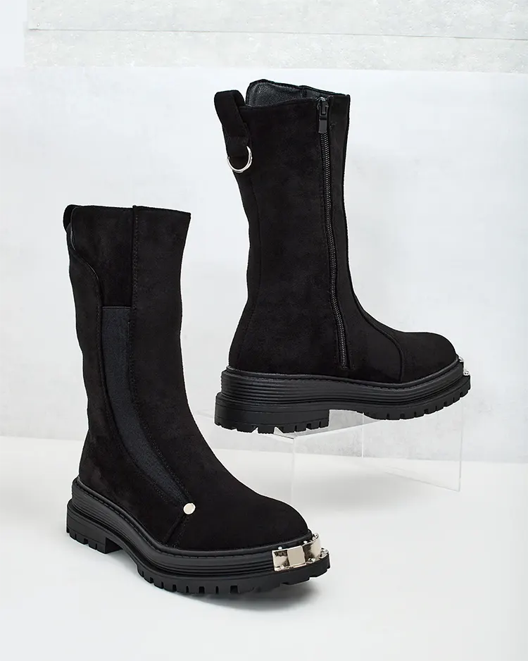 - Женские высокие сапоги на плоской подошве, выполненные из эко-замши. Внутри подкладка из мягкого меха, модель на молнии. Идеальный вариант для осени!