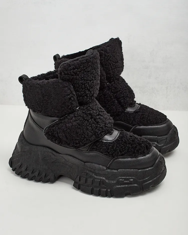 - Нестареющие женские снежные сапоги. Верх выполнен из экологичной кожи со вставками а'ля овчина. Утеплитель в виде меха внутри, ботинки застегиваются на липучку. Идеальный вариант для холодного времени года!