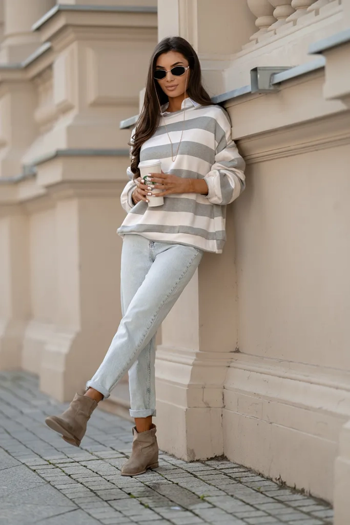 - Женский свитер с круглым вырезом из приятной ткани в полоску. Модель имеет длинные рукава. Прекрасная основа для зимних нарядов!