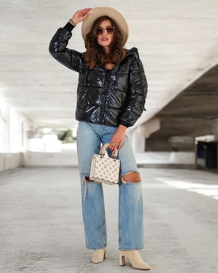 - Теплая женская зимняя куртка. Стеганая модель, имеет 2 кармана на молнии, наполнитель синтетический пух и застежку-молнию. ПРИМЕЧАНИЕ: Точность измерения (+/-) 1 см.