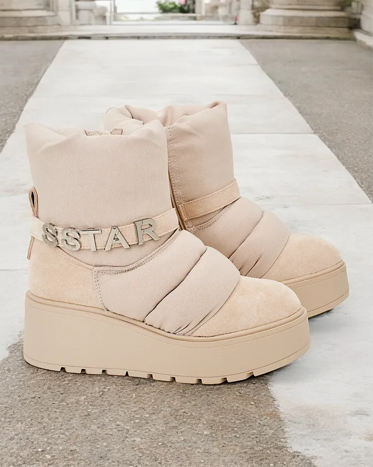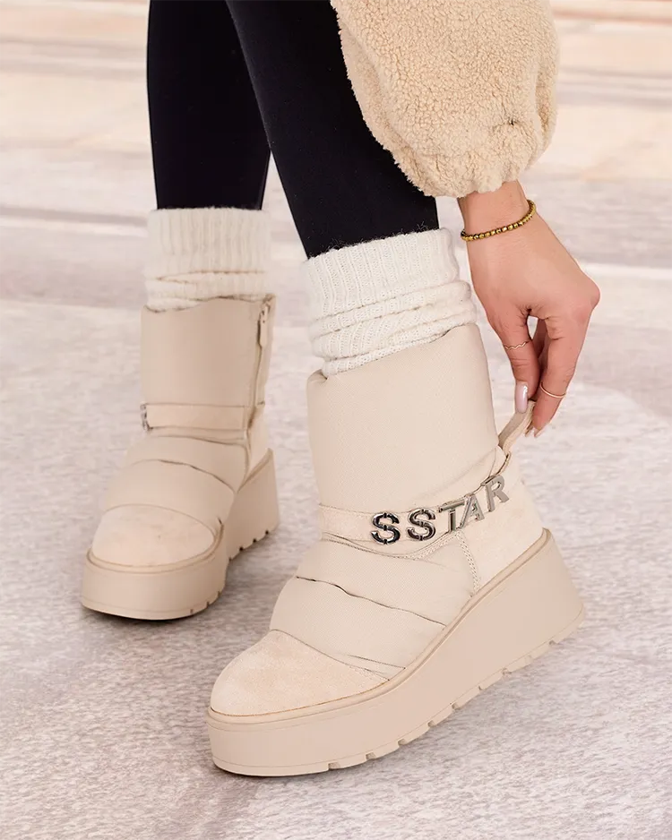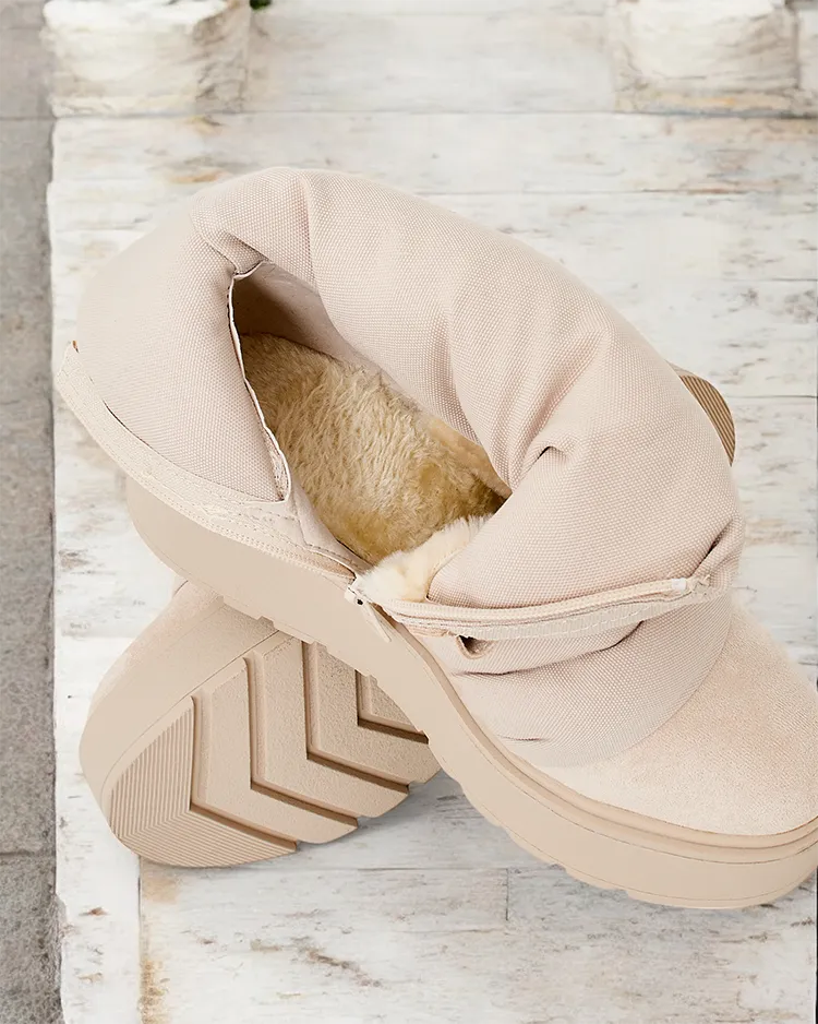 - Женские сапоги-снегоступы с верхом из комбинации замши экокожи и тканевого материала. Внутри приятный мех, застежка на молнии. Идеальный вариант для зимы!