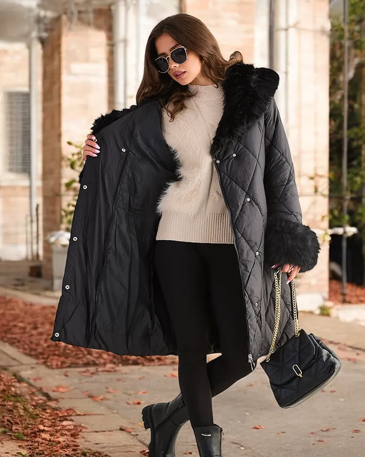 - Теплый стеганный женский зимний пуховик с воротником и рукавами, украшенными мехом, и двумя карманами. Пуховик застегивается на молнию и кнопки. Модель наполнена синтетическим пухом. Идеально подходит для зимы!