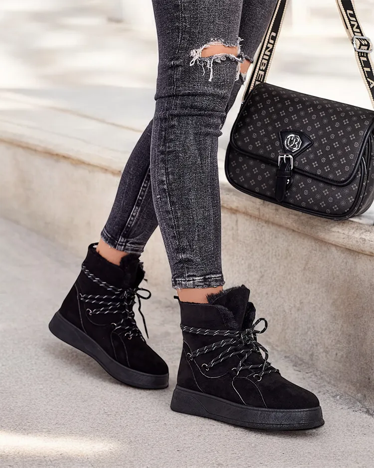 - Женские зимние ботинки с верхом из замши и экокожи. Внутри приятный мех, ботинки можно надеть на ногу и закрепить на шнуровке. Идеально подходят для зимы!