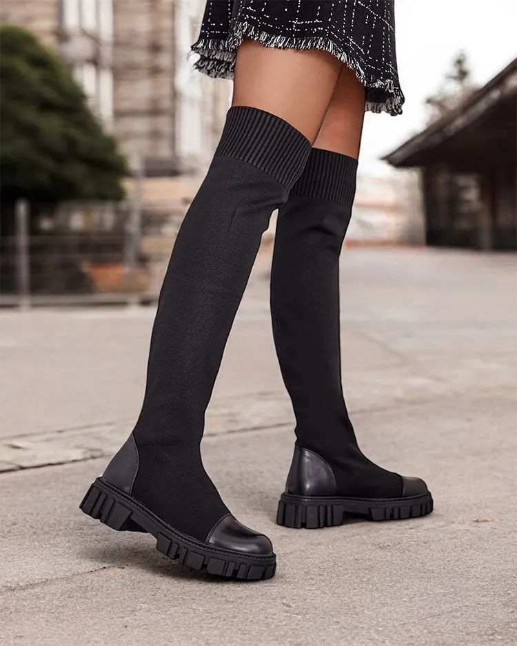 - Стильные женские сапоги выше колена на толстой подошве. Верх изготовлен из гибкого тканевого материала с вставками из эко-кожи, с тканевой стелькой внутри. Модель на застежке. Идеально подходят для повседневных осенних нарядов!