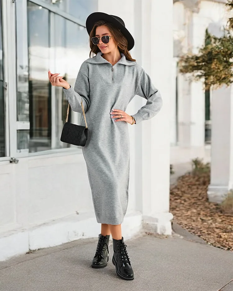 - Женское свитерное миди-платье с длинными рукавами. Модель выполнена из вязаного полотна. Горловина застегивается на молнию. Незаменимая вещь на этот сезон! Примечание: Точность измерения (+/-) 1 см. Измерения проведены на плоскости.