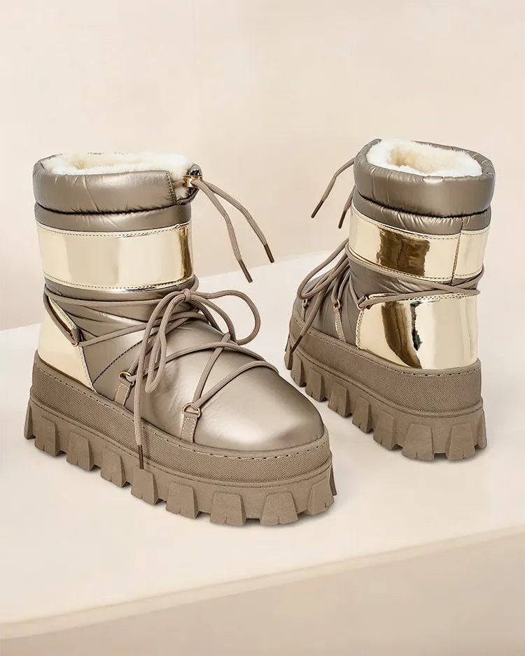 - Женские снежные ботинки с верхом из комбинации ткани, напоминающей вощеную ткань, и патентной эко-кожи. Внутри приятная меховая подкладка, ботинки на молнии и на шнуровке. Идеально подходят для зимы!