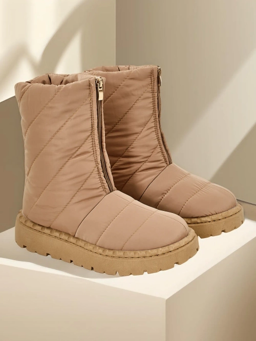 - Женские снежные сапоги с верхом из материала, напоминающего церату. Внутри есть меховая подкладка, а на обуви есть молния посередине. Идеально подходит для холодного сезона!