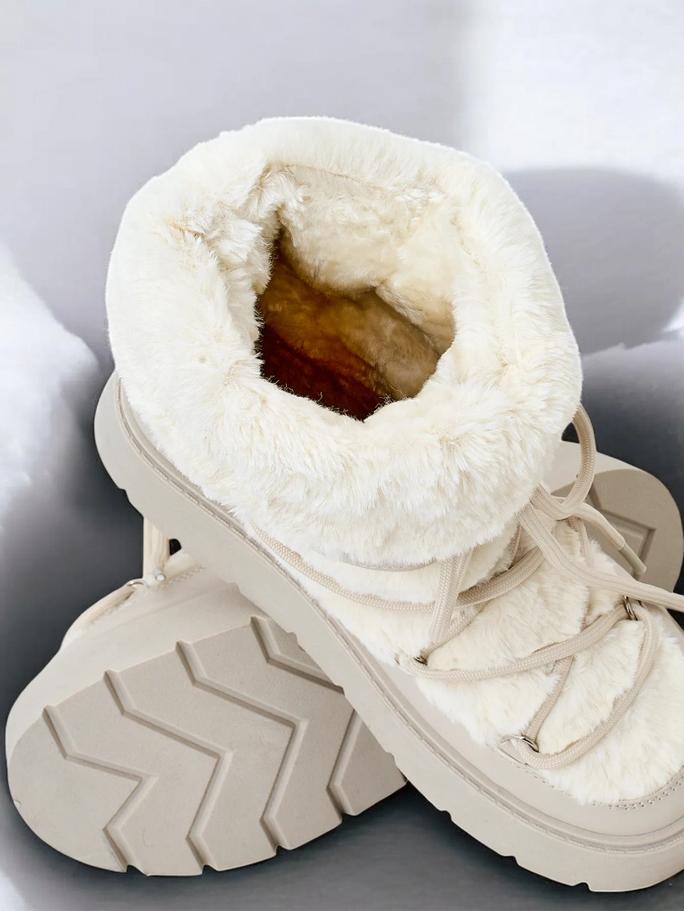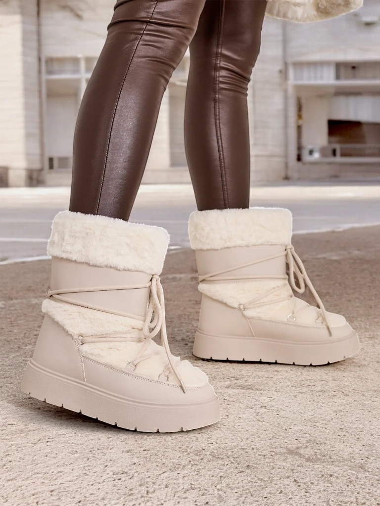 • Женские снежные ботинки с верхом из комбинированной эко-кожи и приятной ткани. Внутри уютный мех, а ботинки имеют шнуровку. Идеальны для зимы!
