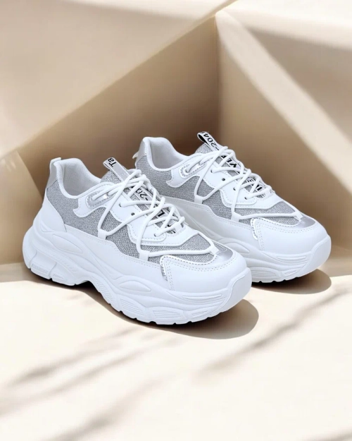 - Женская спортивная обувь в виде кроссовок на толстой подошве. Изготовлены из экокожи с блестящими вставками. Текстильная стелька. Отличное дополнение к вашим повседневным нарядам!