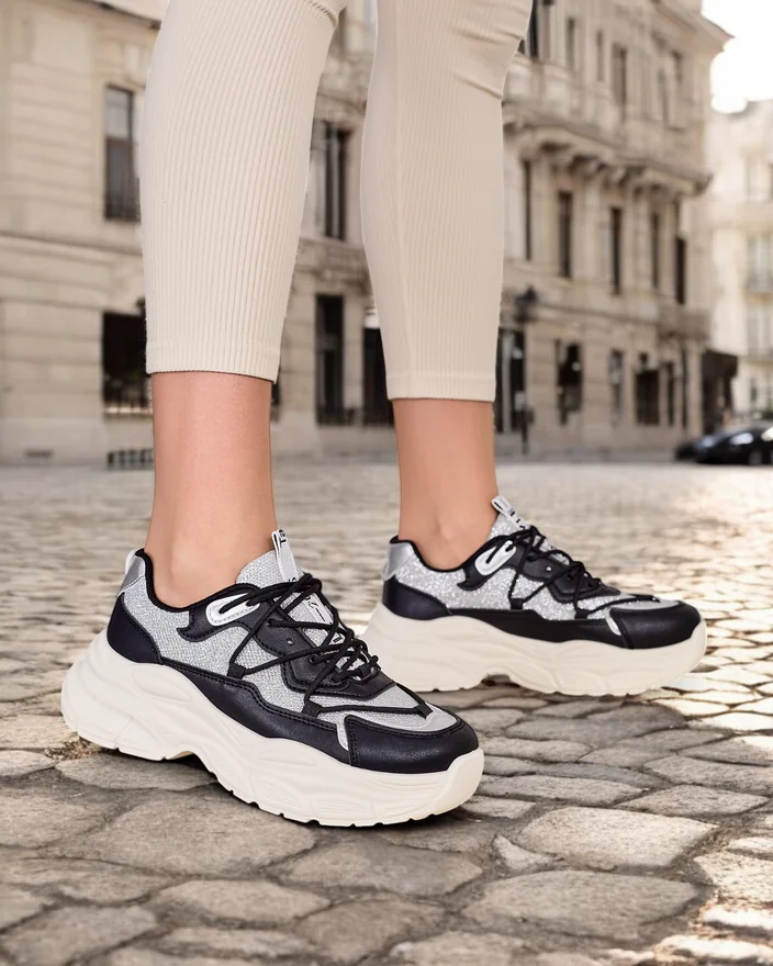 - Женская спортивная обувь в стиле кроссовок с толстой подошвой. Изготовлена из эко-кожи с блестящими вставками. Тканевая стелька. Отличное дополнение к вашим повседневным образам!