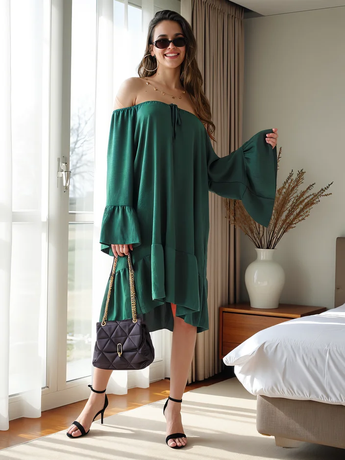 • Удивительное платье в испанском стиле, выполненное из легкой, воздушной ткани. Модель до колена с длинными рукавами, украшенными рюшами, и эластичным вырезом, который подчеркивает силуэт. Полно charme и легкости!