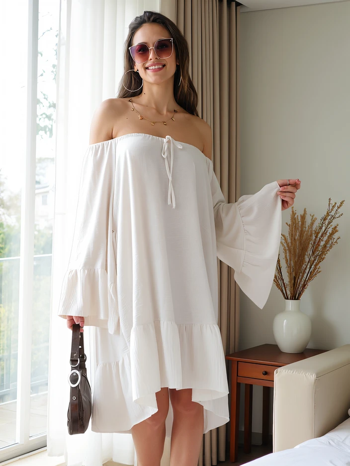 - Удивительное платье в испанском стиле, выполненное из легкой, воздушной ткани. Модель до колена с длинными рукавами, украшенными рюшами, и эластичным вырезом, который подчеркивает силуэт. Полно charme и легкости!