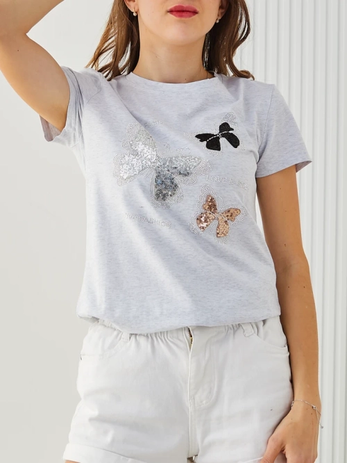 • Оригинальная женская блузка с круглым вырезом, сшитая из мягкой и приятной на ощупь ткани. Вся блузка украшена яркими пайетками, а короткие рукава добавляют легкости. Идеальный выбор для создания модных и стильных образов!