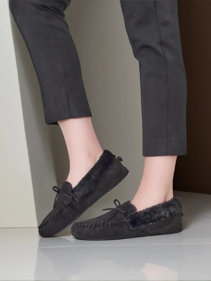 • Стильные женские мокасины на плоской подошве. Пара изготовлена из замшевой экокожу. Внутри подкладка из меха. На носке есть декоративный бантик. Идеально для повседневных образов!