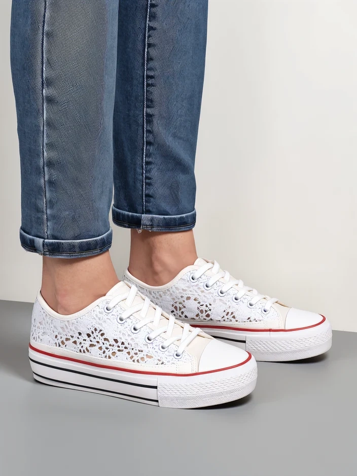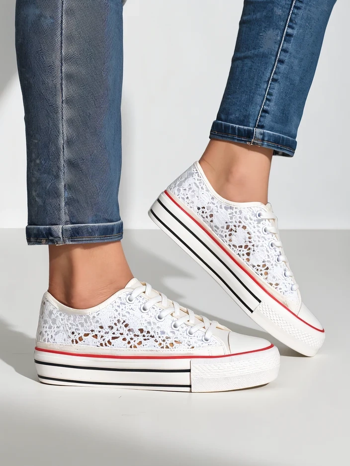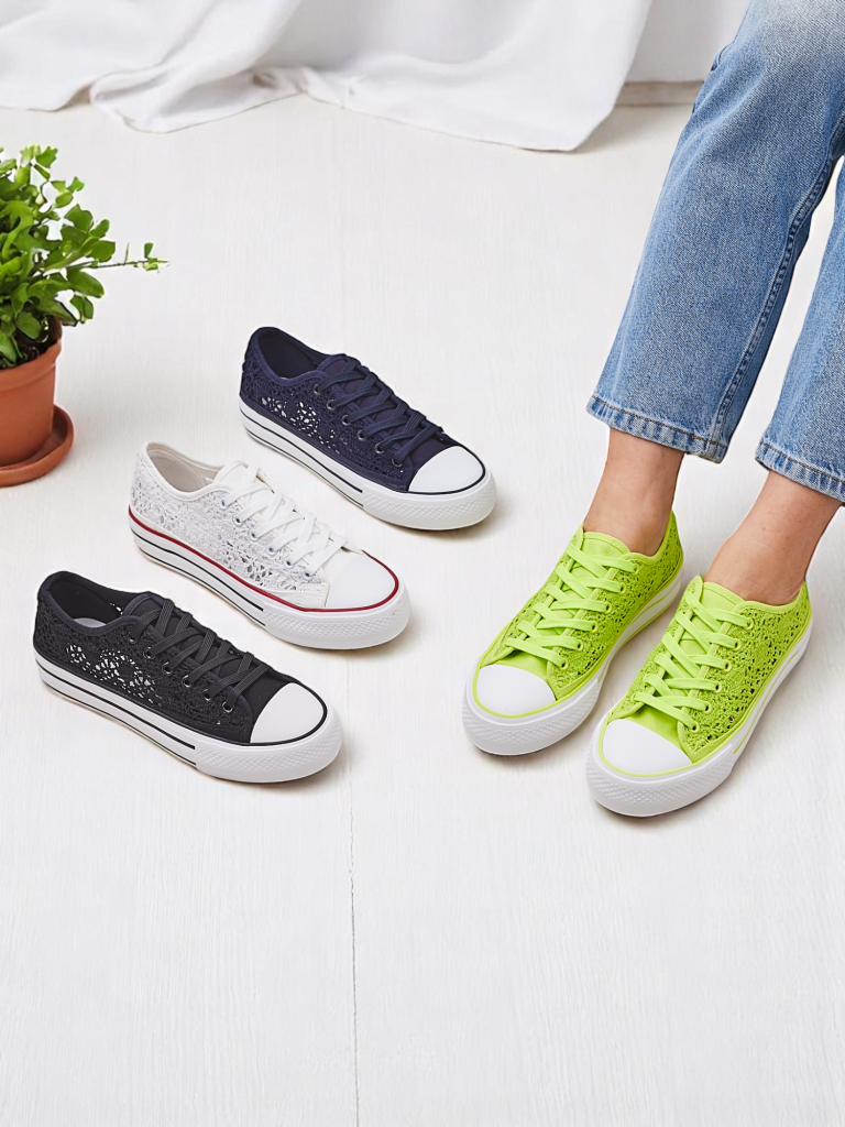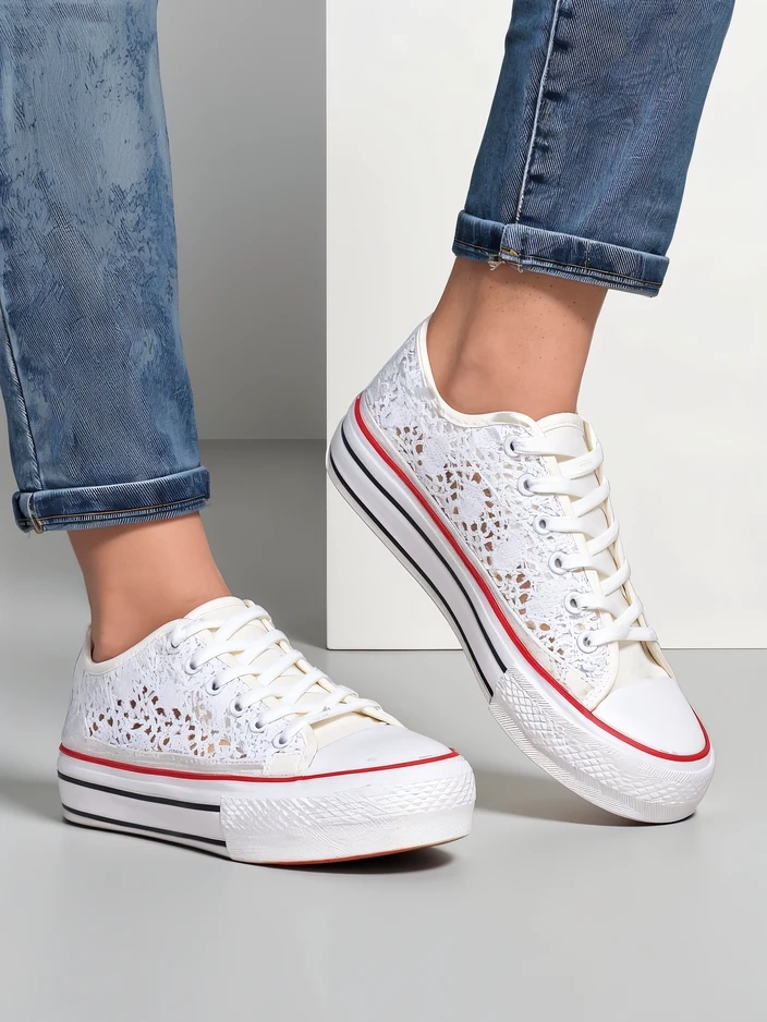 - Damskie buty na płaskiej podeszwie. Para w stylu casual jest wykonana z materiału tkaninowego z ażurowym wykończeniem, wkładka tkaninowa. Model posiada ozdobny haft. Idealne dla tych, którzy cenią komfort!