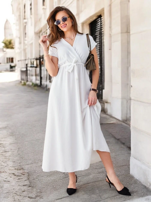 - Женское миди-платье с эластичным поясом. Модель с короткими рукавами, обернутым вырезом и поясом. Обязательная вещь в вашем гардеробе!