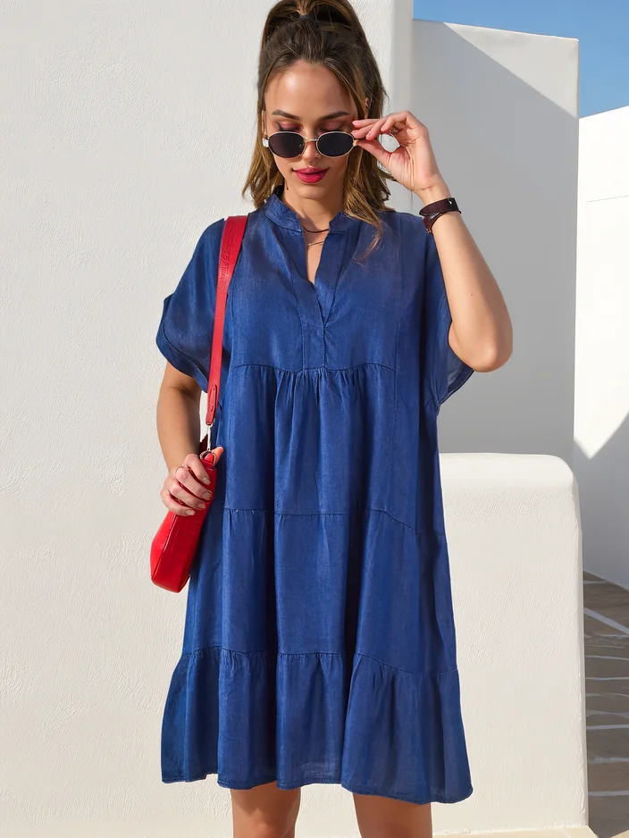 - Простая женская туника, напоминающая джинсовое платье с V-образным вырезом и короткими рукавами. Сделана из приятного материала. Почувствуйте весеннее настроение с ней!