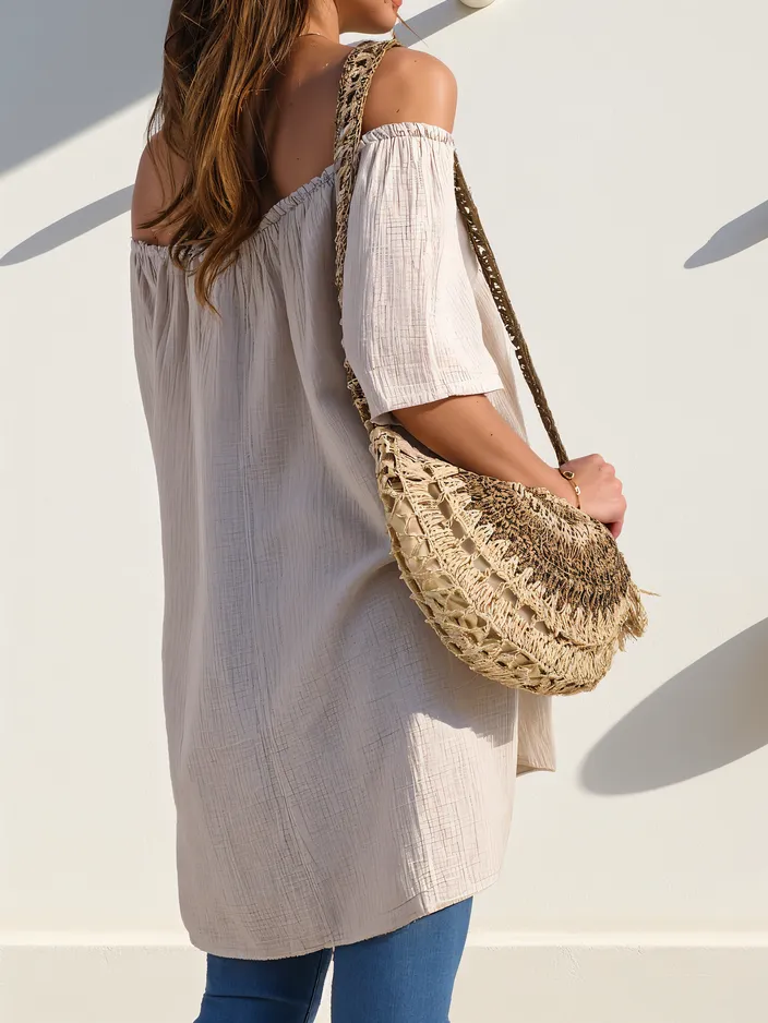 • Элегантная женская блузка из хлопка в испанском стиле с тонкими декоративными пуговицами. Идеально подходит для теплых дней, сочетая комфорт с женственным, романтичным стилем.