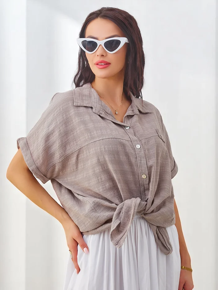 • Рубашка женская из хлопка с тиснением и короткими рукавами. Модель с V-образным вырезом, застежка на пуговицы. Невозможный предмет в гардеробе каждой женщины!