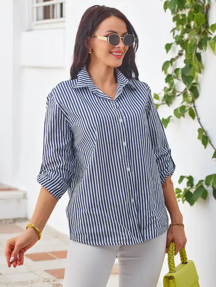 - Женская полосатая хлопковая рубашка с завязкой внизу — это легкий и модный вариант для весны и лета. Ее классический полосатый узор и деталь завязки придают ей современный и расслабленный характер. Идеально подходит для повседневных нарядов.