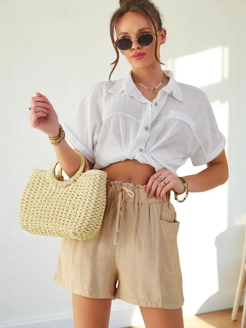 - Легкие женские тканевые шорты. Модель с высокой талией, с двумя карманами и резинкой на талии. Идеальный выбор для лета! ПРИМЕЧАНИЕ: Точность измерения (+/-) 1 см.