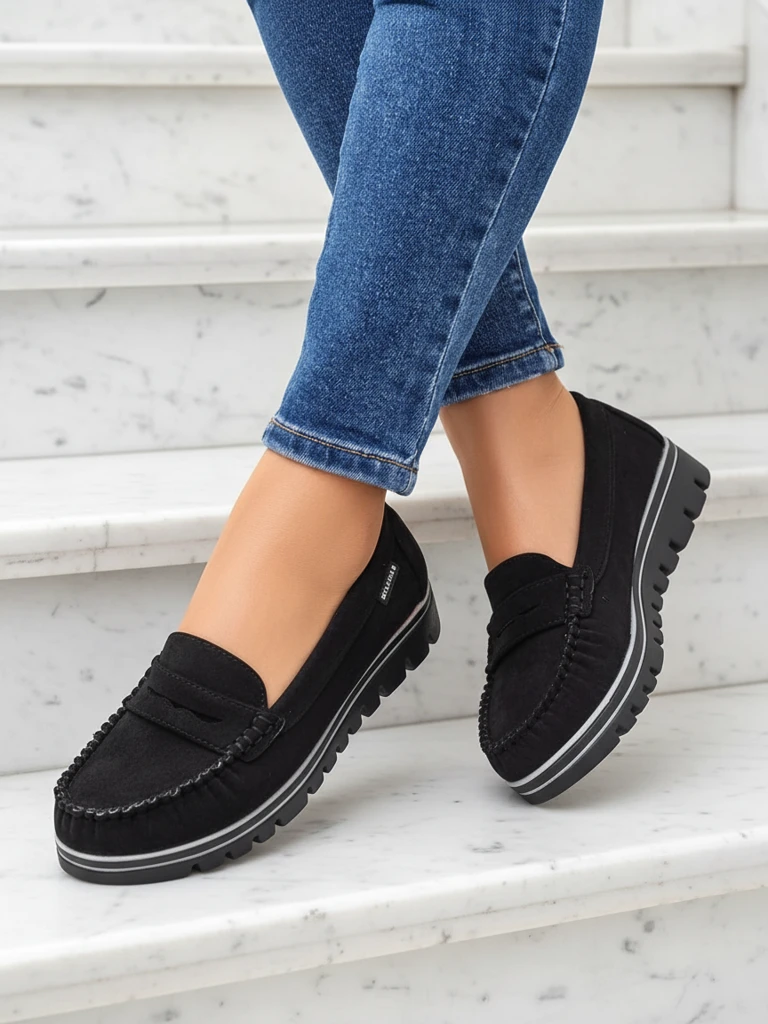 Откройте для себя новые черные мокасины Sabella, сочетающие в себе элегантность и исключительный комфорт. Эти туфли, изготовленные из высококачественной экологичной замши, не только стильно выглядят, но и заботятся об окружающей среде. Натуральная кожа стельки обеспечивает отличную вентиляцию и мягкость, что делает их ношение в течение всего дня чистым удовольствием. Благодаря плоскому каблуку высотой 3,5 см эти мокасины идеально подходят как для работы, так и для повседневных встреч с друзьями. Отличительные особенности: - Экологичная замша, рифленая подошва для лучшего сцепления - Легко надевать - отсутствие сложных застежек, что делает их удобными для повседневной носки. Мокасины Sabella отлично сочетаются с разными стилями. Вот несколько предложений: 1. Повседневный образ: сочетайте мокасины с джинсами и футболкой, чтобы создать непринужденный повседневный стиль. 2. Элегантный образ: сочетайте их с классическим платьем и легкой курткой в прохладный день. 3. Городской шик: подходящие чиносы и блейзер дополнят ваш современный образ. Чтобы сохранить высочайшее качество обуви, рекомендуется регулярно чистить ее влажной тканью и избегать контакта с водой. Мокасины не требуют сложного ухода, но их следует хранить в сухом месте, чтобы сохранить их первоначальную форму. Время для покупок! Выберите сейчас свои идеальные мокасины Sabella и следуйте современным тенденциям моды, сочетающим комфорт и изысканный стиль.