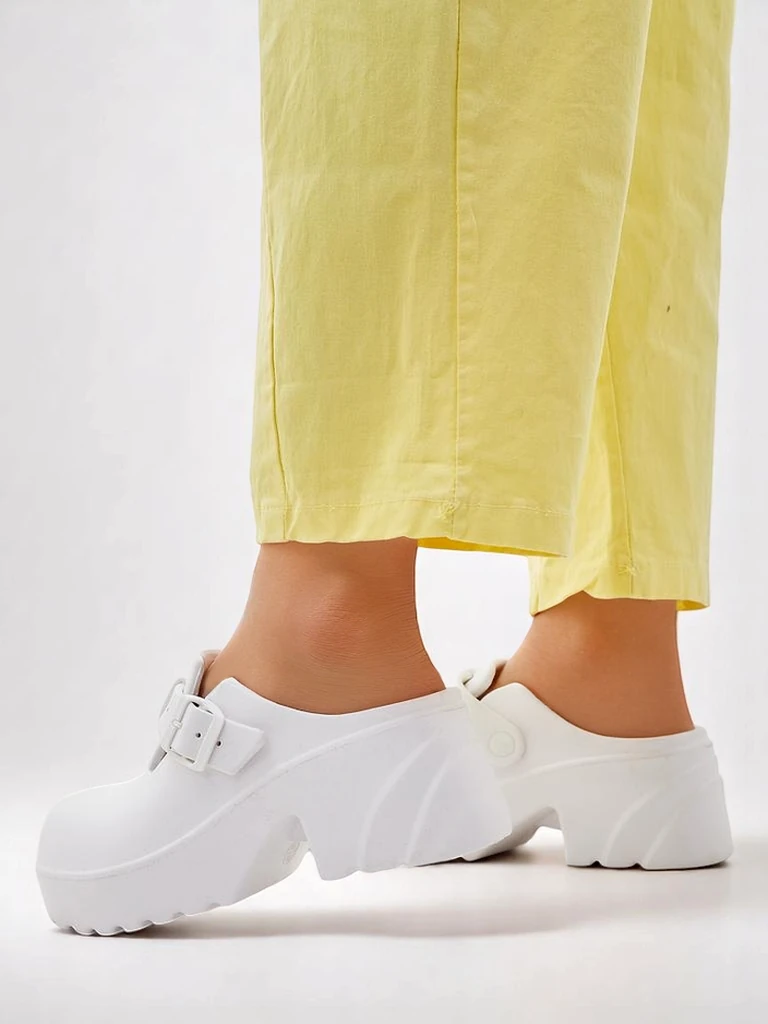 - Подчеркните свой летний стиль и наслаждайтесь комфортом с этими сандалями на каблуке. Модель выполнена из резинового пластика. Украшена круглым носком. Платформа украшена пряжками. Это идеальный выбор для летних дней!